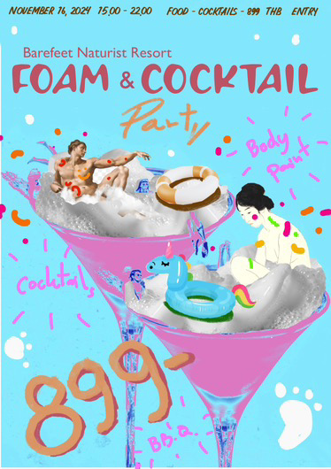 Barefeet Naturist Resort invites you once again on Saturday 16 November 2024 to our legendary Foam & Cocktail Party starting at 15.00 (3 pm) followed by a Salad and BBQ Buffet at 18.00. Special for tonight!! Our Mixologist Mr. Oung will make 3 specials cocktails for each participant. This evening, we will also play a bit around with body paint colors 🙂