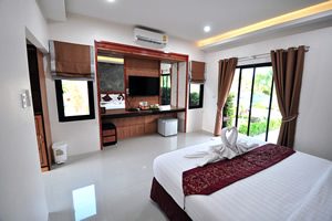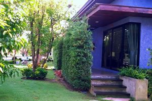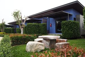 “Baan Ton Beep” are modern style accommodation. They are 40 sq.m. and all have rooms all have large double beds. You have your own toilet and your own terrace outside. The beds have new and comfortably soft mattresses. View to Japanese garden and the Chompu rooms.